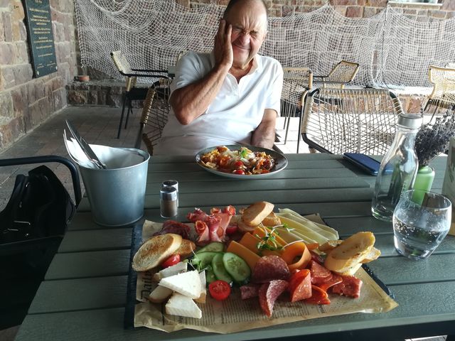 Reggeli az étteremben, és döntés: Vidám testvérünk visszamegy Lellére egy tárgyalás miatt, mi hárman felmegyünk a révfülöpi kilátóhoz, sport program keretében. A kikötőbe visszatérve áthajózunk Boglárra, és a túra záró vacsoráját a szőlőskislaki Malom fogadóban tartjuk. Így is lett: a sport program a telefonom szerint 12860 lépés volt, dombnak fel, dombnak le. A gyaloglást csak egy fagylalt szakította meg a révfülöpi közforgalmú kikötőnél.