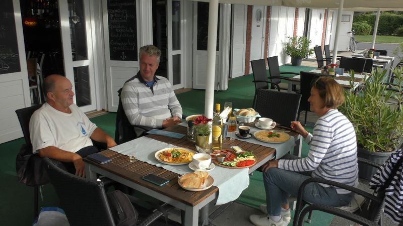A csőig szembeszél cirkálás, a csőben és utána ~1,5 km motorozás, majd a felépült 2-3Bf-os nyugatiban kellemes vitorlázás Révfülöpre, a volt OT kikötőbe. 18 óra 30 körül kötöttünk ki, vacsora a kikötői étteremben. Bográcsos kolbászos lecsó, friss kenyérrel, mellé fröccs. Az ár/érték arány messze jobb, mint Tihanyban, elfogadható. Kellemes éjszaka után reggeli az étteremben, majd indulás Balatongyörökre, 11 órakor.