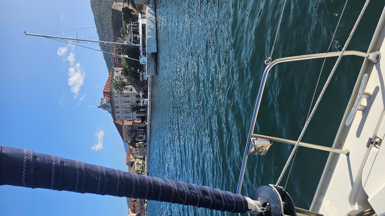 Tehát vitorláztunk. Az aspiráns László volt az aktuális kormányos, aki váltig állította, hogy az adott takkal simán kimegyünk a kastellai öbölből, Lupo testvér nem kis tapasztalatát felülbírálva. …. Nem fért ki! Két forduló és némi motor rásegítést is igénybe véve, már irányba is volt a Spliti Kapunak nevezett Solta és Brac Sziget közti átjáró. A motor meghajtás támogatása már nem volt szükséges! Természetesen a szél melyben haladtunk, minimális korrekciót vitt a haladásunkba, ezért a szükséges irányból kezdett fújni. Ezt mi a magas intelligenciánk és sok hajós tudásunknak köszönhetően 30 fokot ejtett a kormányos. A művelet a hajó utazó sebességét az 5 csomó körüli szinten megtartotta, csak éppen Stromorska lett az új irány.