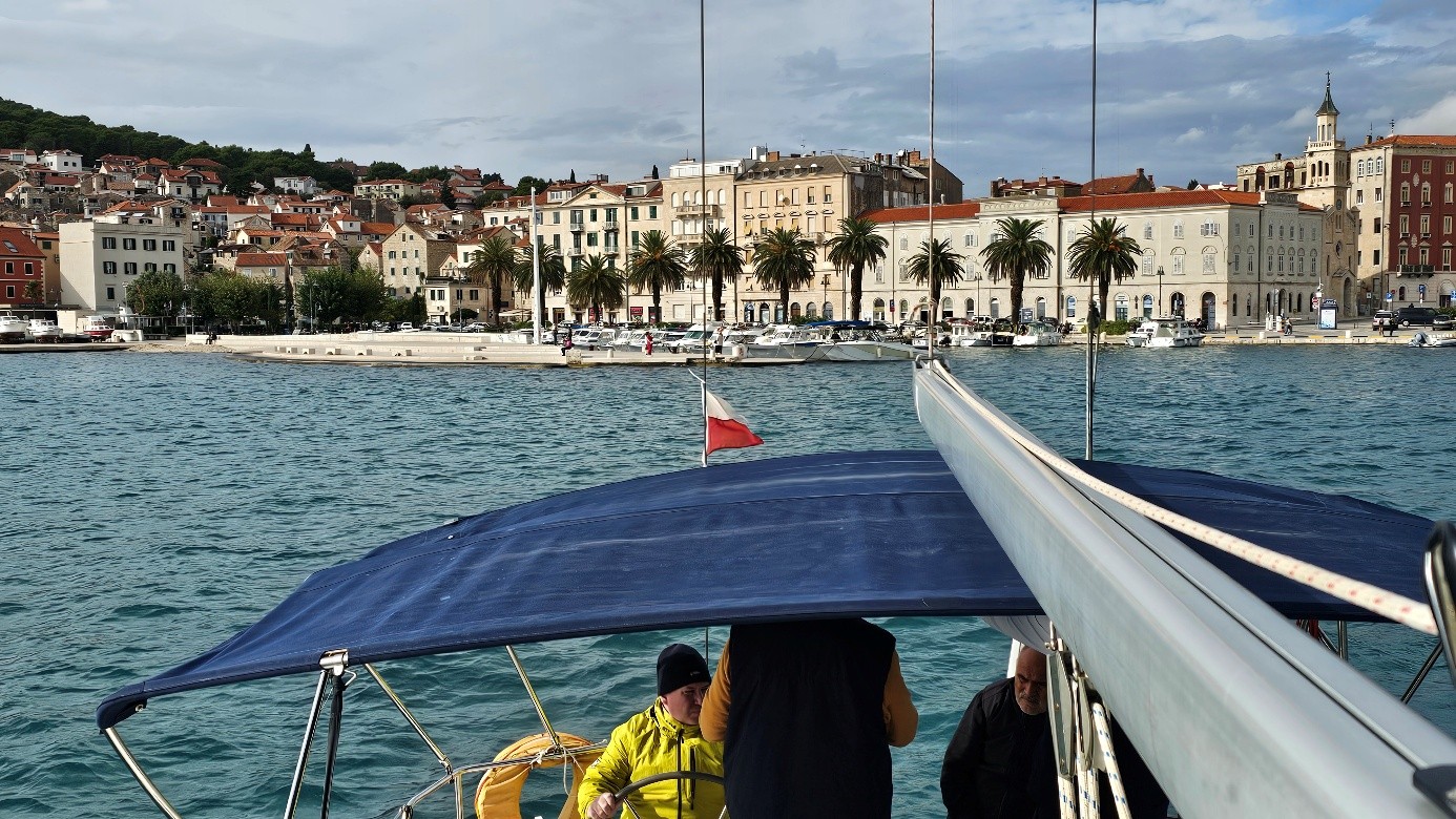 Eseménytelen kissé oldalhullámos vízen történő 3,5 órás út után Splithez közeledtünk. A fent említett anyahajó, továbbra is a kikötő elött állomásozott, melyet próbáltunk közelebbről megszemlélni. Ezt a horvát rendőr hajók és személyzete nem így gondolta és határozott módon tovább tessékelt minket. Ennek ellenére a csúcstechnika eszközeink segítségével, készítettünk pár használható fotót. Majd tovább haladtunk Splitbe tankolni. A Spliti tankolás hiba nélkül végbement. A tankolás elött 2 kört mentünk a Palota előtt és csak aztán álltunk a kútra.