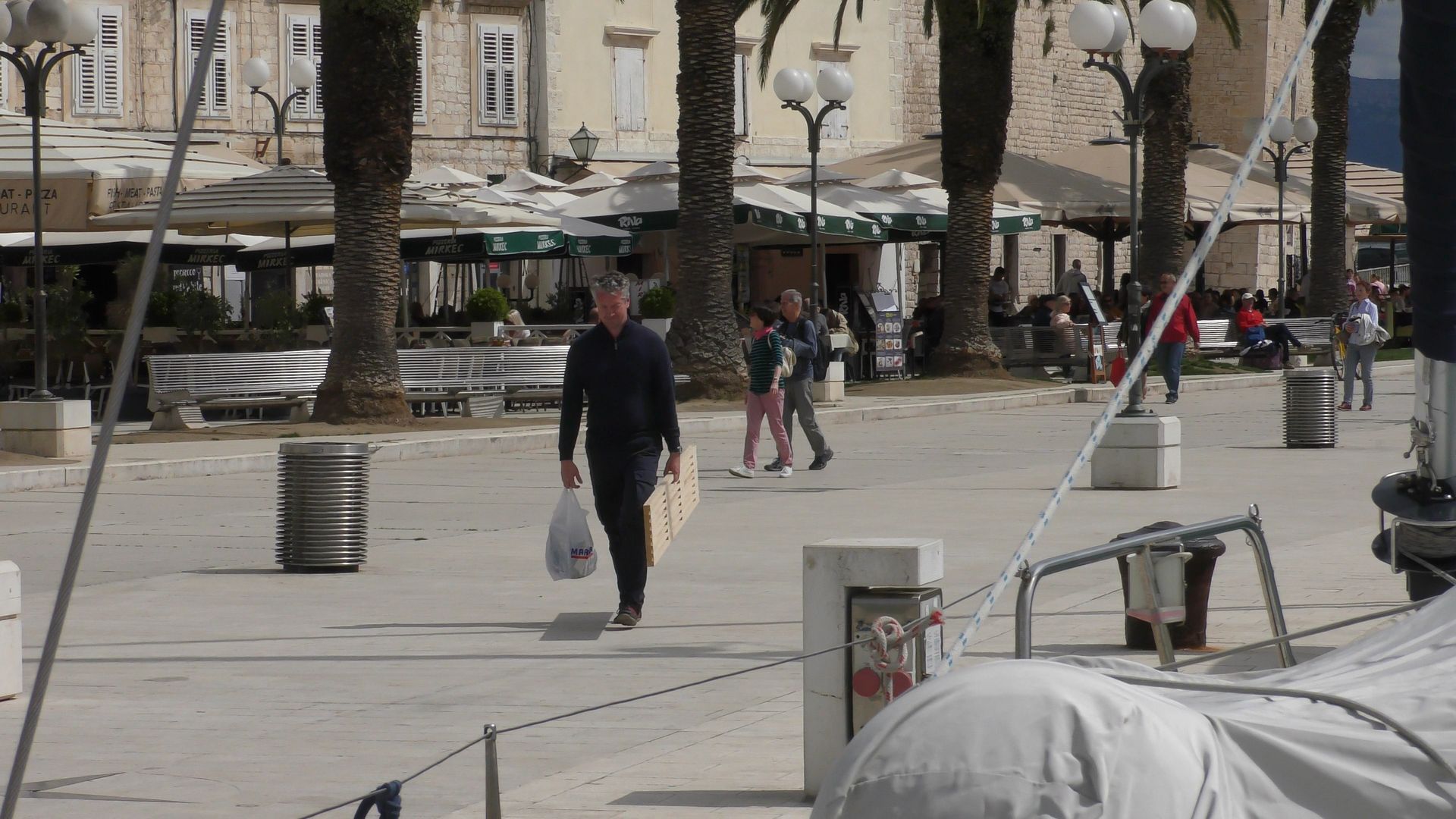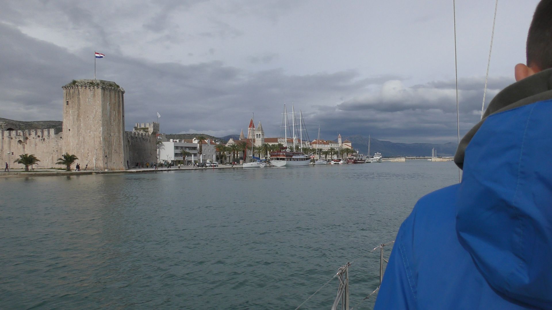 12-én reggel kellemes időre ébredtünk, az egyetlen probléma a szél hiánya volt. A terv szerinti hagymás mangalica szalonnás tojásrántotta után rövid városnézés kávézással, fizetés az ACI-nak a tervvel ellentétben 585 kuna, és indulás 11-kor motorral. Kiérve az öbölből a gyenge keleti szélre felhúztuk a vitorlákat, és amíg lehetett vitorláztunk. Ciovo sziget közepéig jutottunk el vitorlával, ott leszereltünk, és délről kerülve Kraljevac szigetecskét bemotoroztunk Trogírba. A városi partfalon álltunk meg 18 órakor. Visszaállítottuk a költségek tervezett szintjét is, mert „csak” 390 kuna volt a napi díj, amiért gyakorlatilag csak a helyet adták. Ezért leleményes csapatunk felderítette a trogiri ACI marinát is, és ugyan sok sétával, de megoldotta a tisztálkodási igényeket. Este városnézés, majd vacsora a terv szerint. A csapat csendes borozgatás közben úgy döntött, hogy a megmaradt birkapörköltből birkagulyást készít, a tervezett éttermi vacsora helyett. A szükséges kiegészítő alapanyagokat a trogíri piacról szerezzük be, másnap.